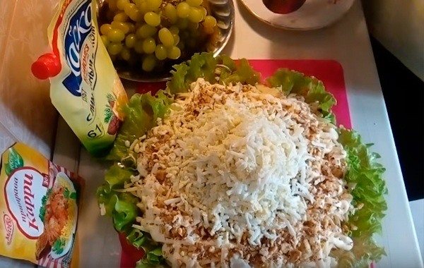 Как всегда, салат выкладывают слоями: курица – яйца- сыр – виноград. Половиной кедровых орешков присыпают курицу, другу использует вместе с половинками виноградин для украшения. Майонез будет между основными слоями салата.
