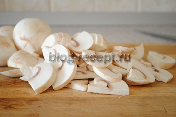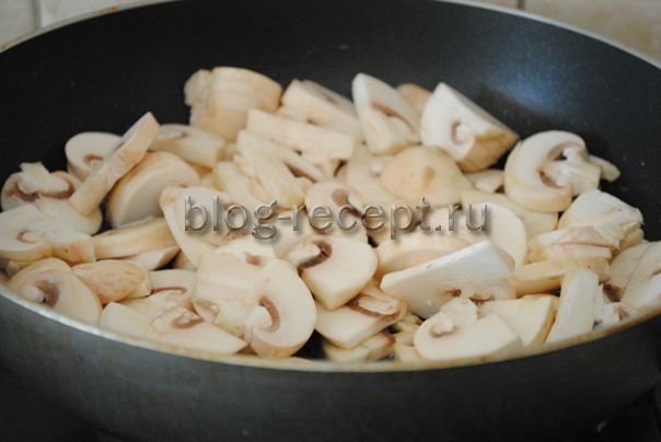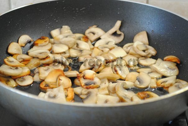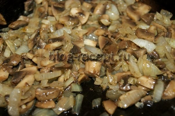 - Разрезать дольками шампиньоны, добавить их на сковороду к луку, тушить до окончательной готовности грибов, по завершении процесса продукты посолить, поперчить, добавить по вкусу специи.