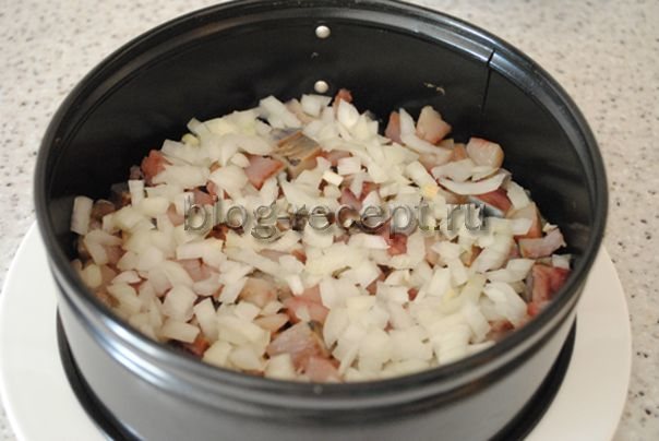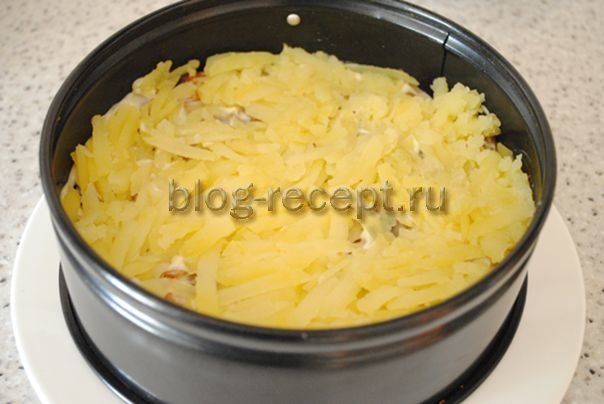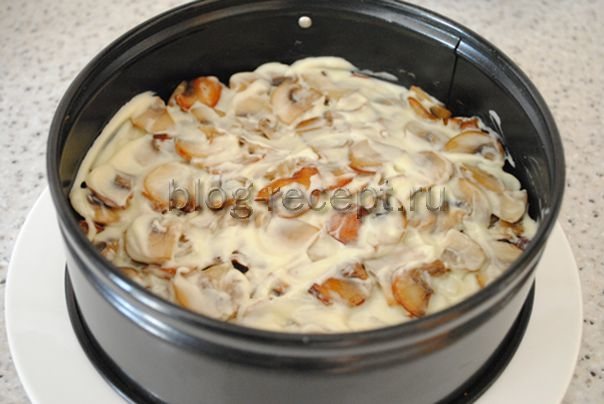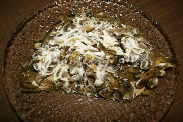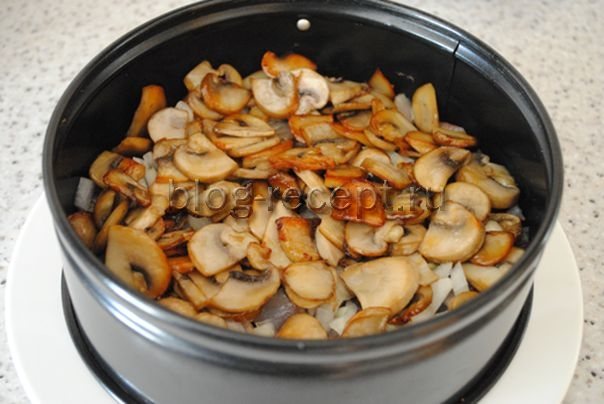 - следующим слоем кладется лук с шампиньонами, поверх — слой майонеза;