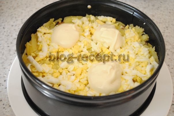 - дальше следует слой яиц и смазывается майонезом, немного тертых белков заранее необходимо оставить, чтобы украсить салат;
