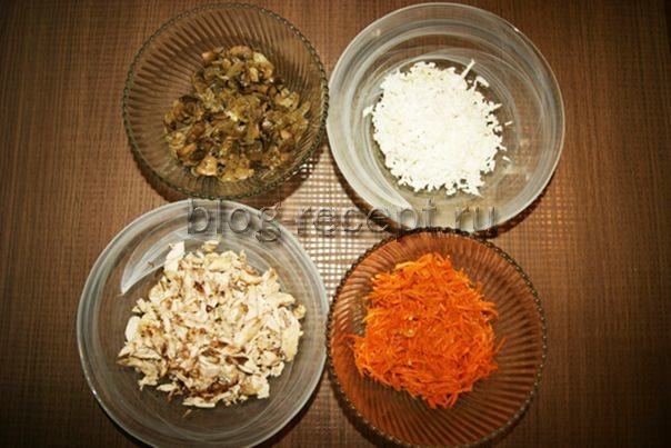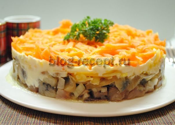 - Салат Лисья шуба с грибами, корейской морковью и курицей