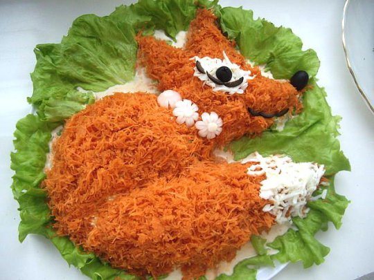 Можно оформить салат в виде лисьей мордочки, ее хвостика или сделать «нору» в салате, похожую на ее убежище.