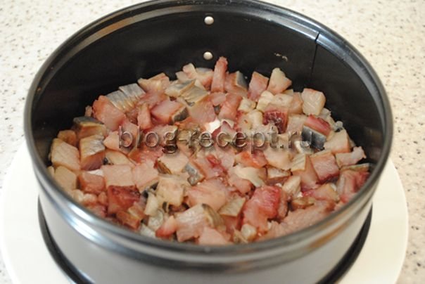 Селедка, нарезанная на мелкие кусочки. Тонкий слой майонеза.