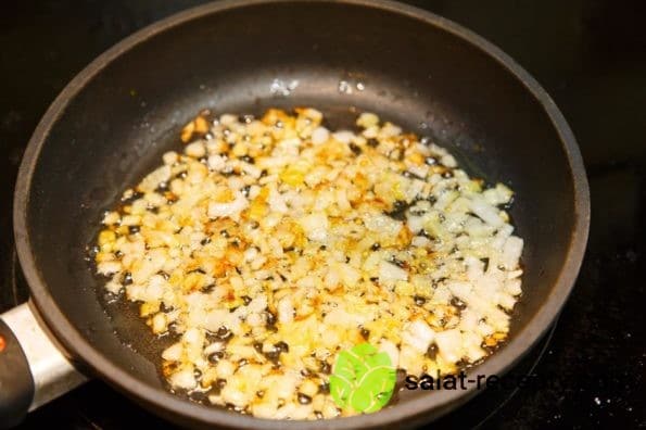 Чистим лук, мелко шинкуем и обжариваем до прозрачности на раскаленной сковороде.