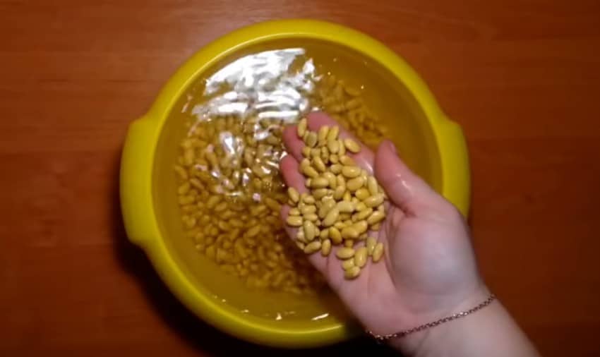 Для этого нужно залить соевые бобы (1 кг) водой и выдержать их в таком виде в течение суток. При этом воду нужно менять 2-3 раза. Соевые бобы имеют растительный привкус. Для этого, чтобы его убрать нужно в воду, в которой они вымачиваются, добавить пару щепоток соли.
