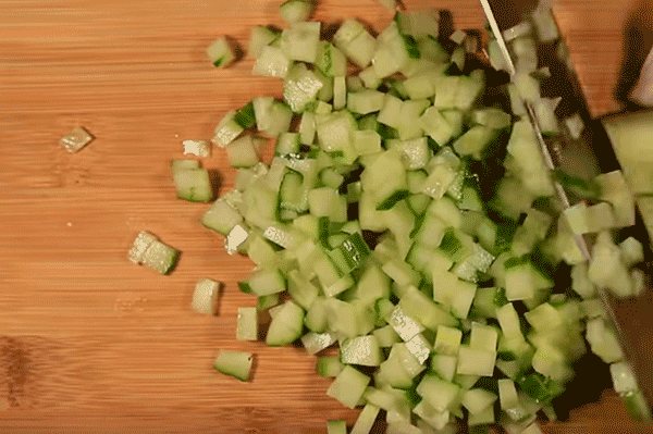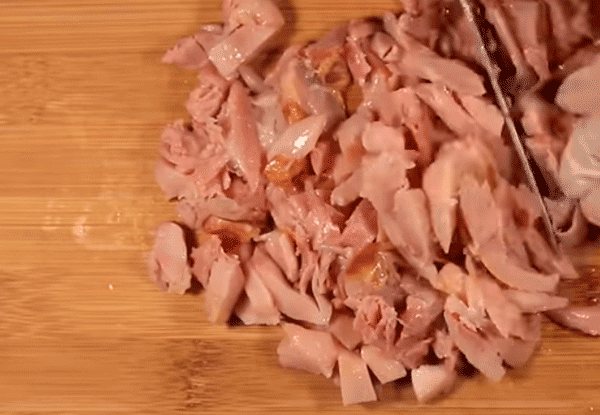 - Нашинкуйте копченое куриное мясо на кубики среднего размера,