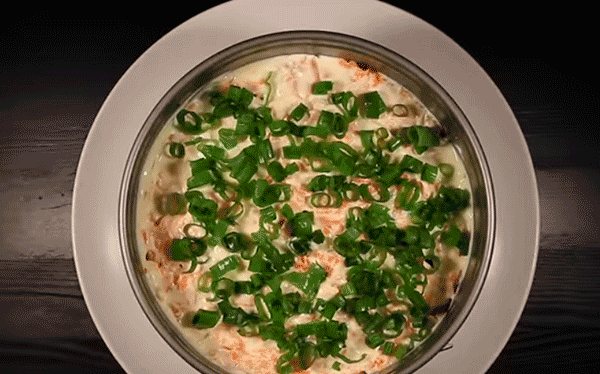 - Готовую запеканку нужно разложить по тарелкам, каждую порцию полить сметаной и посыпать зеленым луком, подавать с острым перечным соусом.