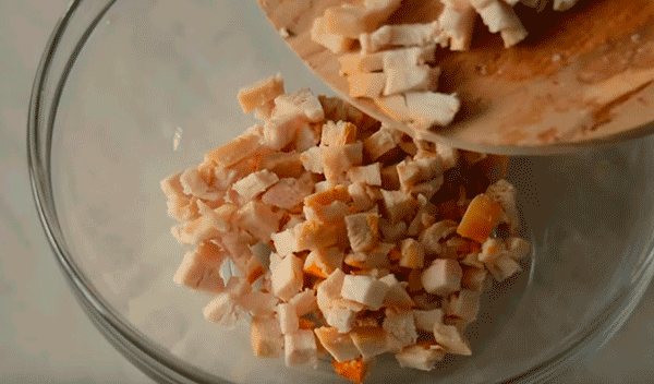 - К ней добавьте нарезанную небольшими кубиками куриную грудку,