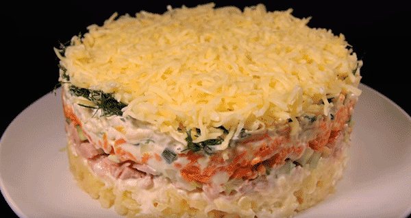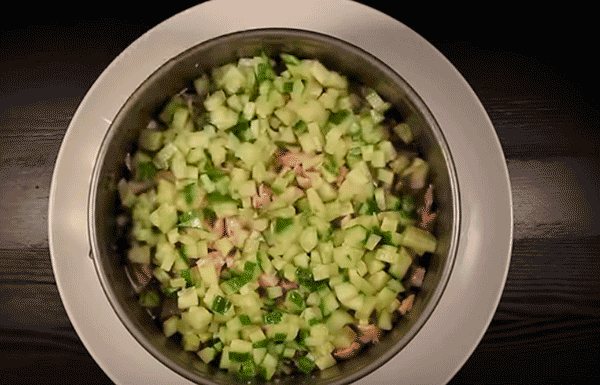 Слоеный салат с копченой курицей и свежим огурцом