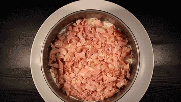 - Необходимо нарезать курицу кубиками и выложить в миску.