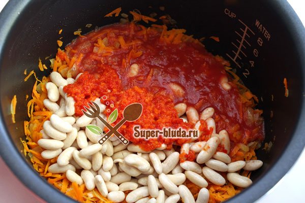 Все ингредиенты перемешиваем до однородной массы. Фасоль в мультиварке готовить на режиме «Тушение», время приготовления – 1,5 часа.