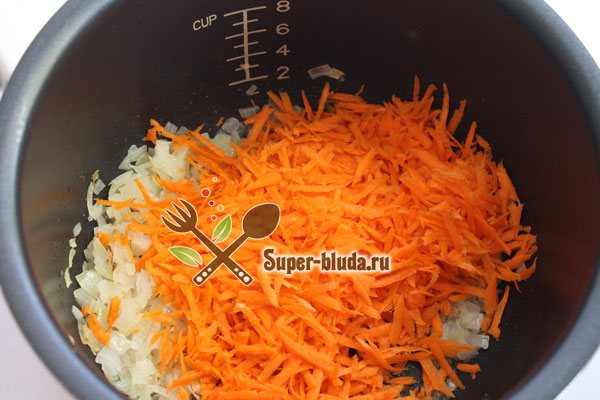 Морковь натереть на крупной терке и добавить к луку. Продолжать тушить на том же режиме примерно 15 минут.