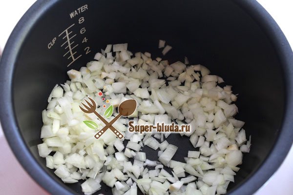 Когда фасоль разбухнет, приступаем к приготовлению. Лук очистить от шелухи и нарезать либо полукольцами, либо крупными кубиками. В мультиварке (у меня dex dmc-60) установить режим «Выпечка» и обжарить лук 7-10 минут.