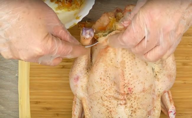5. Даем рисовой массе немного остыть. Для этого оставляем ее на 20-30 минут. Затем фаршируем ею птицу. А чтобы начинка не вывалилась, скрепляем шкурку зубочистками. Сверху оборачиваем цыпу фольгой.