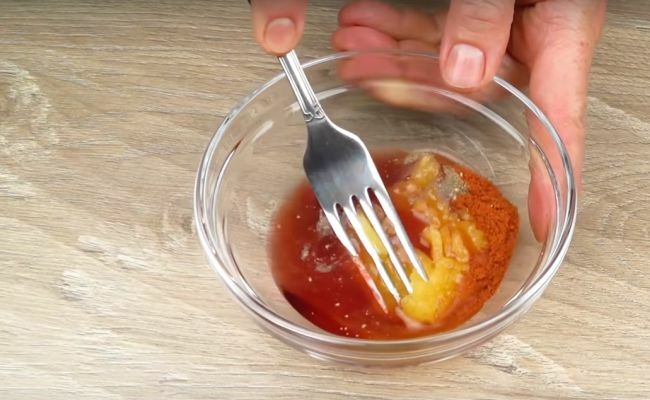 В миске смешайте соль, черный перец, паприку с растительным маслом. Туда же выдавите зубчики чеснока через чеснокодавку