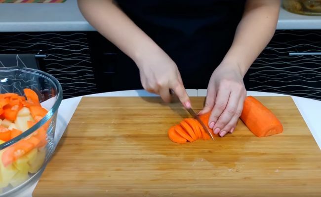 2. Переключаемся на овощи. Очищаем корнеплоды и тщательно промываем их. Картошку шинкуем крупными кубиками, а морковку – кружочками или полукругами (если она сильно крупная). Заливаем нарезку оставшимся маринадом и аккуратно перемешиваем.