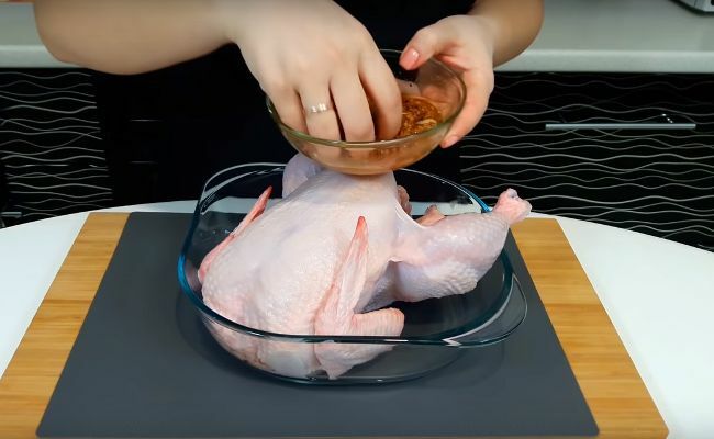 3. Подготовленную птицу помещаем в миску и обтираем маринадом. Тут экономить не нужно: обильно смазывайте тушку изнутри и снаружи. Отправляем заготовку на 3-4 часа в холодильник, чтобы она хорошенько напиталась специями и пряностями.