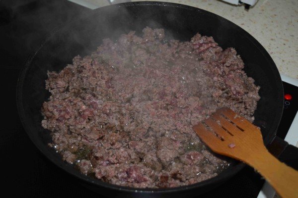 Итак, для начала обжарим фарш на хорошо разогретом оливковом или подсолнечном масле, чтобы жарился, а не тушился. Солим, перчим и обжариваем в течение 7-8 минут.
