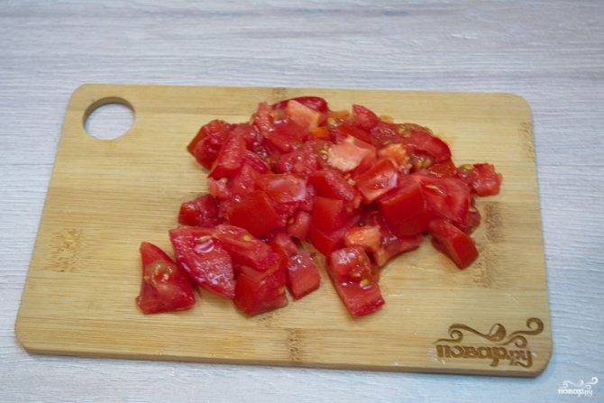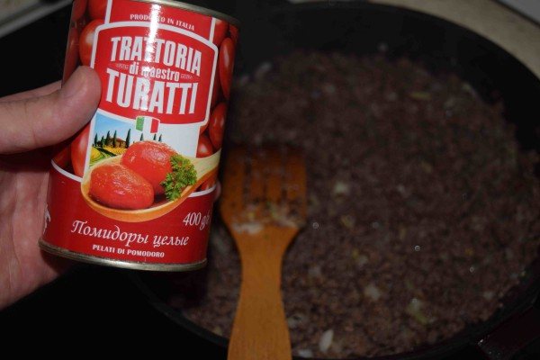 Затем добавляем нарезанный мелкими кубиками лук, продолжаем обжаривать еще минут 7 и добавляем томаты в собственном соку, неважно резаные или целые.
