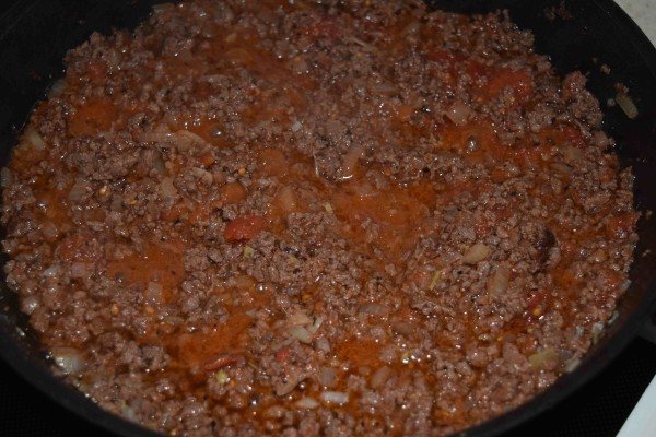 Можете и свежие томаты нарезать, а также можно купить томатный соус «Болоньезе», у «Долмио» есть такой, к примеру. В общем на ваш выбор. Тушите фарш 10 минут в соусе. Начинка готова.