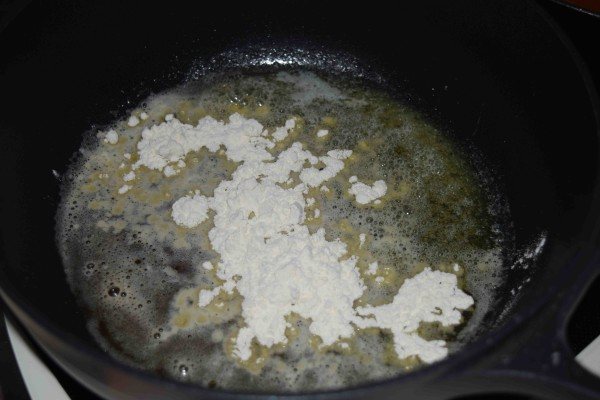 Приступим к соусу Бешамель. Для этого разогрейте на сковороде сливочное масло и насыпьте муку.