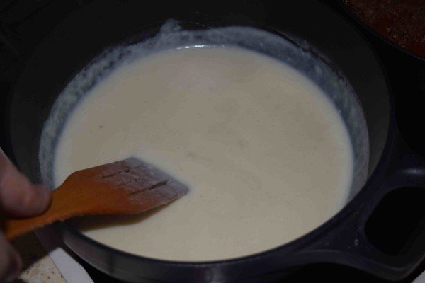 влейте молоко и тщательно перемешайте, чтобы избавиться от возможных комочков. Варите соус до загустения и снимите с плиты, так как он станет еще гуще, пока будет остывать, немножко посолите.