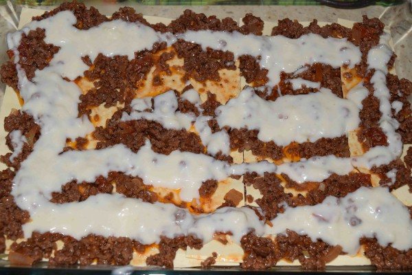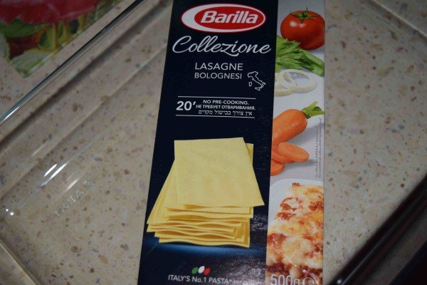 Сделала, сама не планируя, рекламу . Если охота заморочиться и есть время, можете приготовить листы сами, на обычном яичном тесте для любой пасты. Еще момент: если используете готовые, то нет необходимости их вымачивать в воде, они и так станут мягкими под соусом. Выкладывайте листы как угодно, можете ломать их, чтобы заполнить всю форму до краев. Один слой кладите в длину формы, а следующий в ширину, так все лучше схватится. Я подробно показывала этот процесс в рецепте овощной лазаньи. Поверх листов выкладываем фарш и наливаем немного белого соуса.
