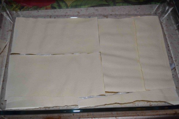 Разделить тесто на равные части (шесть частей), раскатать их с помощью скалки в листы. Листы должны быть тонкими, толщиной около 1–1,5 мм. По размерам формы для выпекания вырезать ножом листы лазаньи.