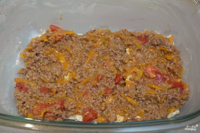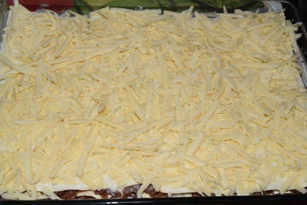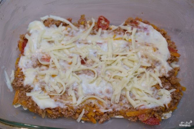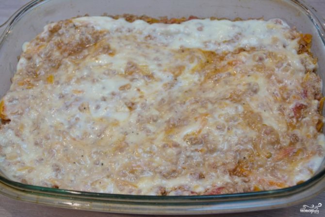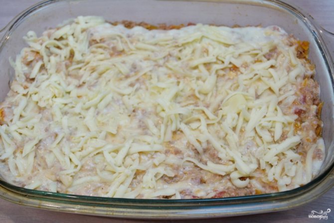 И так повторяйте, пока не закончится фарш. А верхний слой листов просто полейте соусом Бешамель и посыпьте обильно любым натертым сыром.