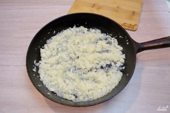 Для приготовления лазаньи нам необходимо подготовить соус «Болоньезе». Для этого измельчите репчатый лук. Его можно нарезать на кубики ножом или измельчить в блендере. Подготовленный лук обжарьте на растительном масле до мягкости.