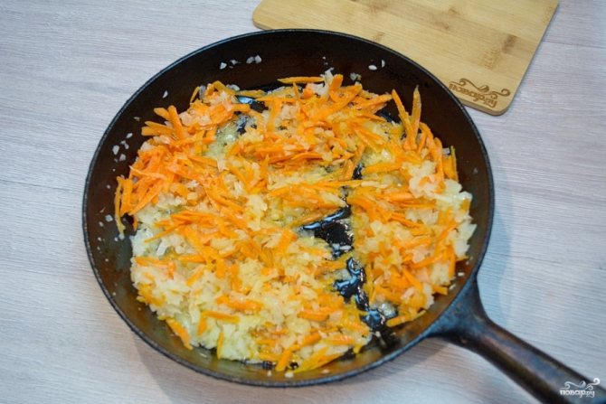 К обжаренному луку добавьте натертую на крупной терке морковь. Обжарьте морковь с луком вместе около 5 минут.