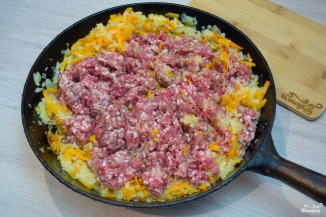К обжаренным овощам добавьте фарш. Я использую домашний фарш, приготовеленный из свинины и говядины.