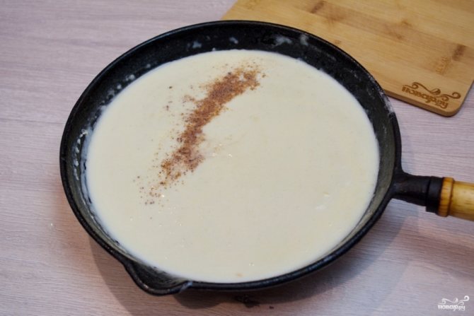 В обжаренную муку введите сливки или молоко. Быстро размешайте. Мука разойдется в сливках и соус станет однородным. Теперь соус можно поперчить, посолить. Обязательно в соус «Бешамель» следует добавить немного мускатного ореха.