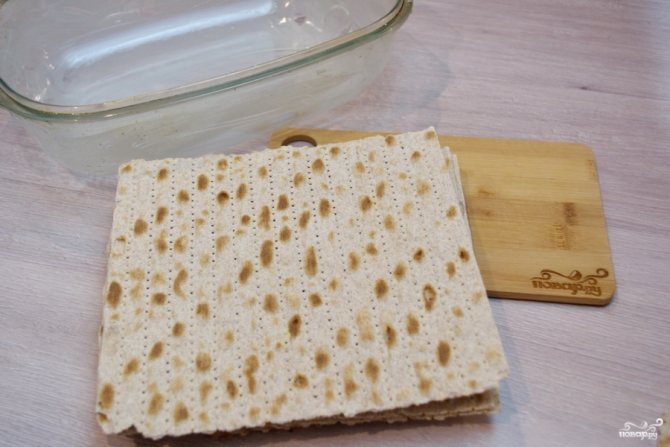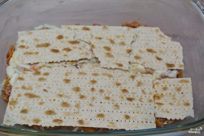 Лазанью можно готовить по-разному. Готовят это блюдо из листов лазаньи, приготовленных дома или приобретенных в магазине. Готовят его и на основе мацы, на основе блинов, овощей типа баклажан или кабачков, цукини. Вариантов может быть множество. Я готовлю данную лазанью на основе мацы. Лисики мацы (не размачивая) кладем в смазанную форму. Если ваш листик мацы шире, чем форма, его можно разломать на небольшие кусочки, из которых затем составить слой.
