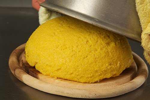 - По прошествии указанного времени снимаем полотенце и трогаем верхний слой каши в емкости. Если он застыл, то кашу можно переворачивать на деревянную доску или блюдо для подачи. Чтобы не дрожали руки — просто накройте доской емкость сверху и резко переверните, прижимая доску к краям емкости. Мамалыга должна легко отделиться и выпасть на доску, держа свою форму.