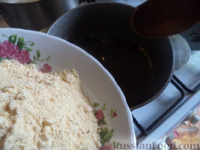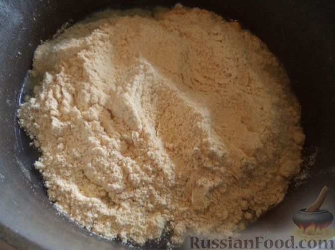 - Кукурузную муку нужно заранее проколить на сковороде без масла.