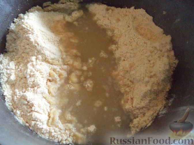 - Далее нужно нагреть казан, налив в него воду из расчёта 1 стакан на 3 стакана муки.