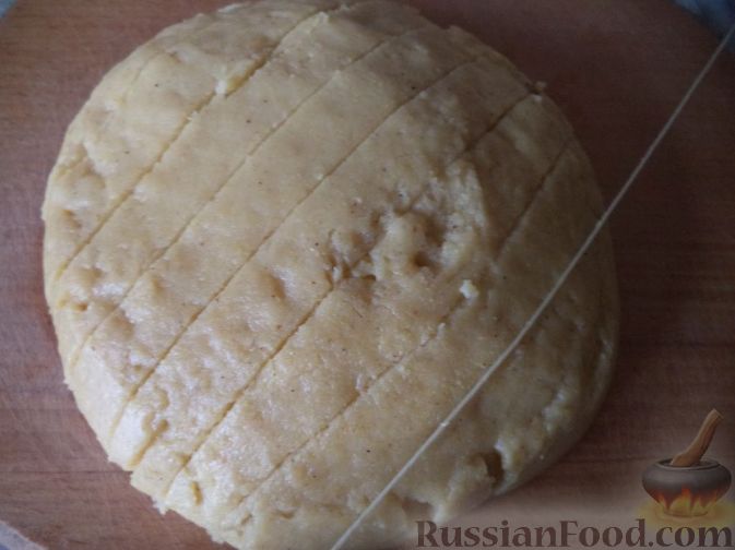 - Нарезается каша из кукурузы с помощью широкого ножа, смоченного в холодной воде или смазанного любым пищевым маслом. Но, в идеале, такое молдавское блюдо разрезают тонкой веревкой, пропитанной растительным маслом.