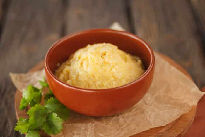 Блюдо из кукурузной муки на основе молочного продукта получается более нежным и воздушным. Сметана может быть 10% или 25% жирности. Чем выше содержание доли жира, тем нежнее получится консистенция. На обезжиренном молочном продукте получится диетическая, но «сухая» мамалыга, похожая на затвердевший хлеб.