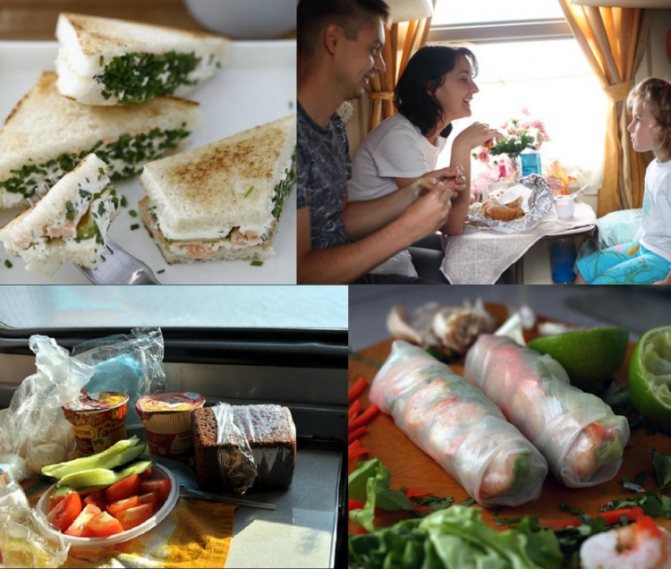 В поезд в принципе можно брать ту же еду в дорогу, что и во время путешествия на автобусе. Но преимущество поезда перед автотранспортом в том, что и в купе, и в плацкарте есть удобный столик, на котором можно разложить продукты. Кроме того, у проводника всегда можно купить чай или попросить кипяток, чтобы заварить чай или кашу быстрого приготовления.