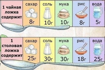 Ниже представлены данные по каждой ложке, а в самом конце есть подробная таблица с популярными граммовками, чтобы не терять время и не утруждать себя лишними подсчетами.