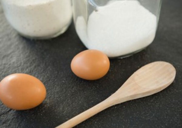 - Сахар смешивают с яйцом, взбивают, слегка подсаливают.