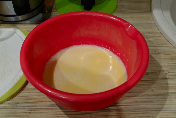 - Добавьте молоко, муку, соль. Взбейте до плотной пены.