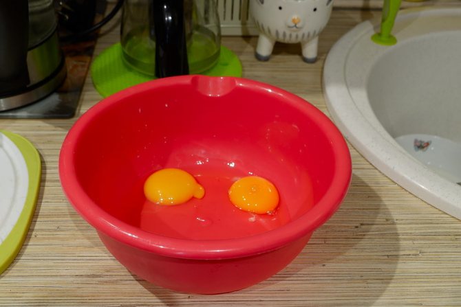 - Разделите желтки и белки, вспеньте белки, соедините их с желтками.