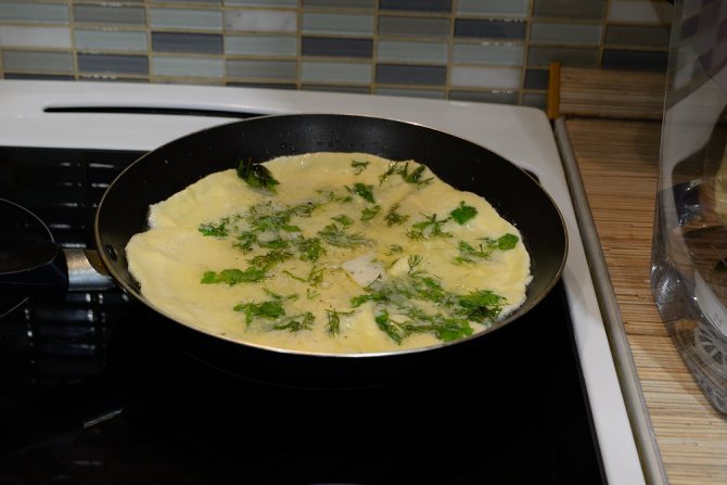 Осталось только пожарить. Наливаем в сковороду подсолнечное нерафинированное масло так, чтоб оно полностью покрыло дно. Включаем средний огонь, ждём пока масло сильно нагреется и выливаем в сковороду основу омлета. Сверху посыпаем укропом и петрушкой.