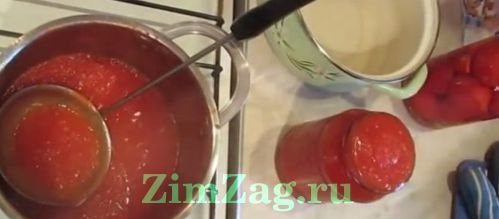 - Влить кипящий томат, закатать заранее простерилизованными крышками.