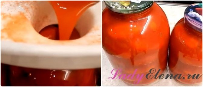 - Залить содержимое банок томатным маринадом, накрыть крышками, оставить на 5 минут, затем закатать.