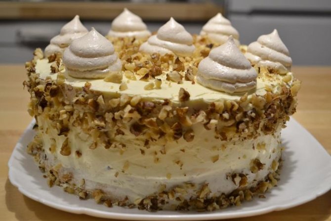 В этом способе приготовления интересно то, что два коржа — песочный и белковый — пекутся одновременно. Два желтка растираем с третью стакана сахара. Добавляем 100 г мягкого сливочного масла, стакан муки и немного гашенной уксусом соды. Замешиваем песочное тесто, разделяем его на четыре колобка. ставим в холодильник на полчаса. Два белка взбиваем с двумя третями стакана сахара. На сковороду укладываем первый песочный корж. Посыпаем его рубленными орешками. Можно немного вдавить их в тесто. Выкладываем ложкой взбитые белки. Печем до четверти часа при 180 градусах до румяности безе. Так поступаем со всеми четырьмя коржами. Перемазываем их кремом на сгущенке. Украшаем орешками.