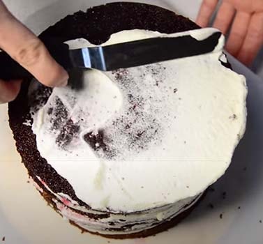 Сверху накрываем коржом, который пропитываем кофе. Верх и бока Шварцвальдского торта смазываем кремом.