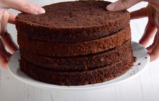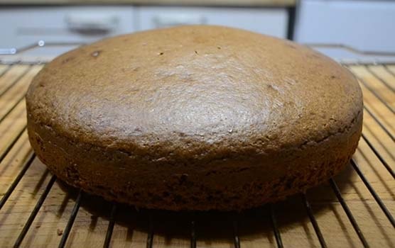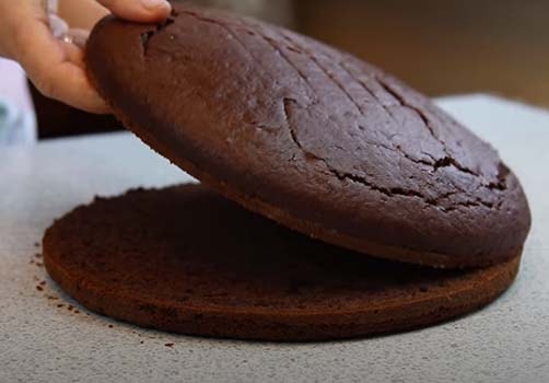 9. Готовый корж остудите как следует и аккуратно разрежьте поперек на два коржа.